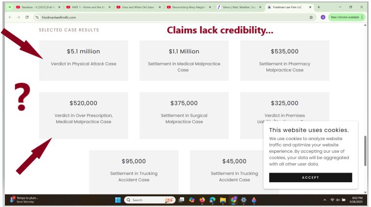 Claims of large verdicts realized by Anthony R. Friedman d.b.a. The Friedman Law Firm Llc. lack credibility