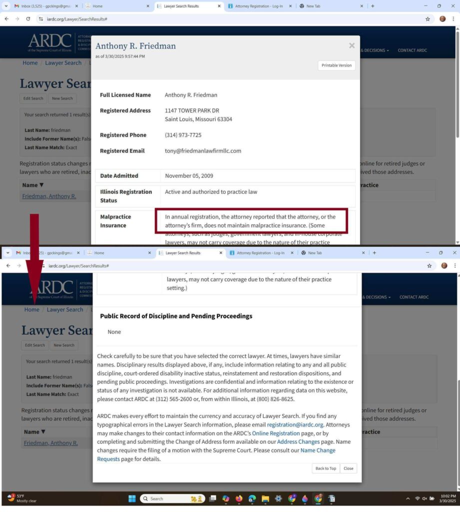 Below is exhibit (4) of the Friedman Law Firms filing with the A.R.D.C. in the state of Illinois indicating that he does not carry professional liability insurance.